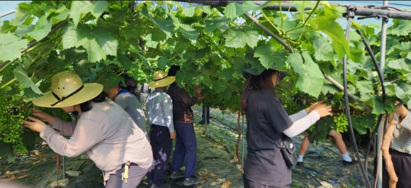 김천시청 투자유치과 직원 11명은 지난 16일 이른 아침 양금동의 한 포도재배 농가를 찾아 포도 열매 솎기를 실시했다.