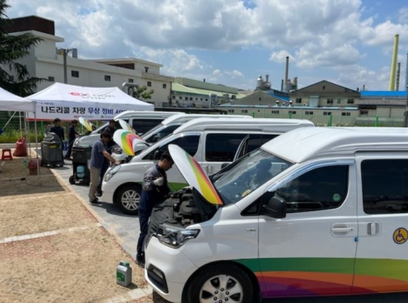 이번 무상 정비 서비스는 나드리콜 특수차량 180대를 대상으로 에어컨 냉매가스 충전, 에어컨 필터교환 등 냉방장치 점검과 와이퍼 교체, 오일류·워셔액·냉각수 보충 등 경정비 서비스를 제공하였으며, 아울러 차량관련 정비 상담 및 차량 자가 점검 교육 등도 병행하였다.