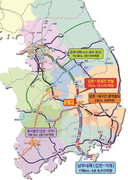 미래 100년 먹거리 산업 생태계를 구축하고 광역교통망을 확충해서 김천 발전의 청사진도 크게 그려 놓았다. 김천시에서 경남 거제시까지 연결하는 남부내륙철도는 총연장 177.9㎞에 4조8천억원을 투입해 2028년 개통한다. 이와 관련해서 2022년 1월, 김천역사 환승을 위한 증·개축비 89억원을 포함해 기본계획을 확정·고시했고 현재 기본 및 실시설계를 추진 중에 있다.