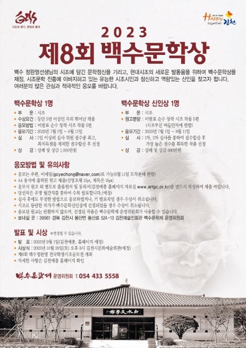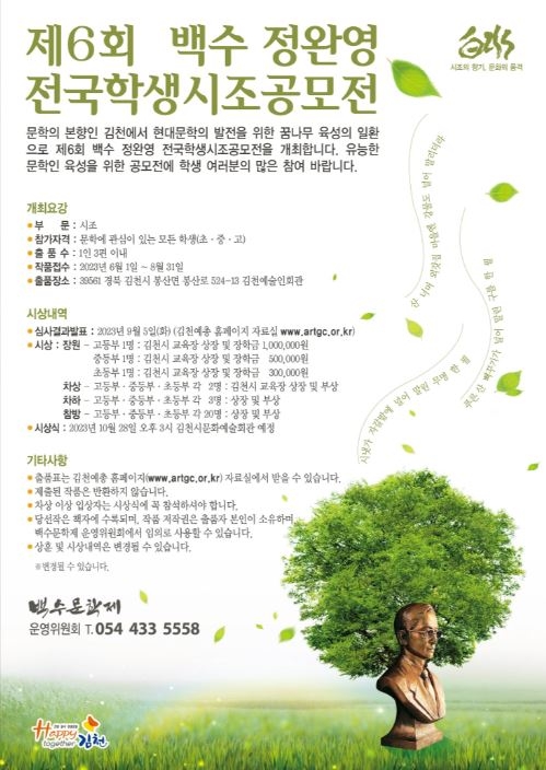 김천시(시장 김충섭)는 백수(白水) 정완영 선생의 시조에 담긴 문학정신을 기리고 시조문학 진흥에 이바지할 유능한 시조 시인과 참신하고 역량 있는 신인을 찾기 위해 「제13회 백수문학제」를 한국예총 김천지회(지회장 최복동) 주관으로 개최한다고 밝혔다.