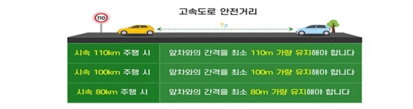 특히 과속으로 인한 사망자수는 3명으로 연평균 1명보다 3배 높은 것으로 나타났다. 또한 7월 평균 빗길 사망자수는 4명으로 연평균 1.4명보다 2.9배 높았다. 이는 본격적으로 장마가 시작되는 7월에는 강우량이 증가함에 따라 빗길 미끄러짐 사고가 급증한 것으로 분석된다. 하계휴가철이 시작되는 올 7월에는 고속도로 이용객들은 안전운행을 위해 다음사항을 준수해야 한다. 고속도로에서는 안전 운전을 위해 반드시 안전거리를 유지하여야 한다. 통상 시속 100km 주행 시 앞차와의 간격을 최소 100m 가량 유지해야 하는 등 제동을 위한 충분한 안전거리를 확보해야 한다.