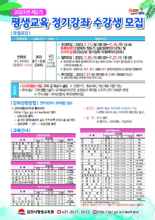 김천시평생교육원에서는 「2023년 제2기 평생교육 정기강좌」 37개 과목 797명을 7월 17일부터 우선 모집을 시작으로 8월 1일까지 선착순 모집한다고 밝혔다.