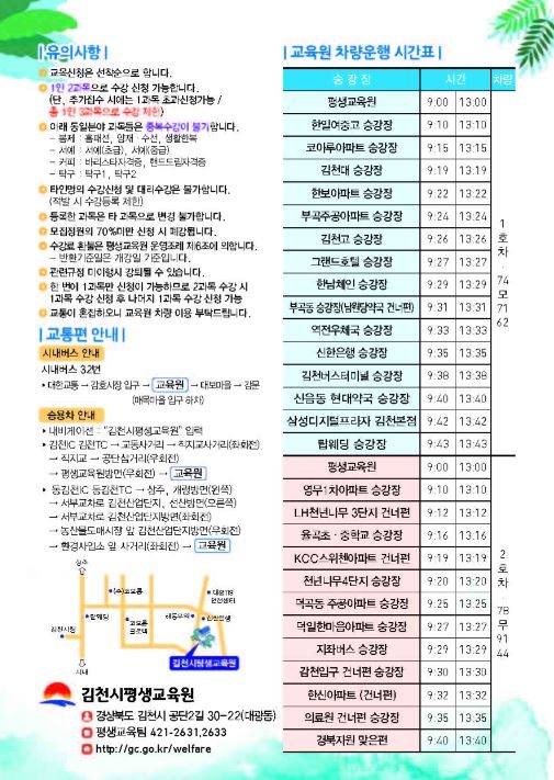 이번 2기 수강생 모집인원은 797명으로 1기 때보다 43명 증원하여 많은 시민이 평생교육에 참여할 수 있도록 지원할 예정이다. 수강료는 4개월간 32,000원이고 김천시평생교육원 홈페이지(http://gc.go.kr/welfare)를 통해 선착순으로 수강 신청이 가능하다.