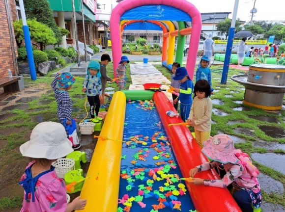 공립단설 상주감꽃유치원(원장 우윤숙)은 7월 11일(화)에 유치원 놀이터에 물놀이장을 설치하고 ‘야호! 신나는 물놀이’를 실시하였다.
