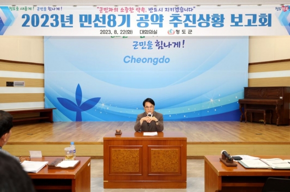 청도군(군수 김하수)은 지난 22일 군청 대회의실에서 민선 8기 부서별 공약 추진상황을 점검하고 추진상의 문제점 및 대책을 논의하고자 국장 및 관과소장, 읍면장, 팀장 등 130여 명이 참석한 가운데 공약 추진상황 보고회를 개최하였다.