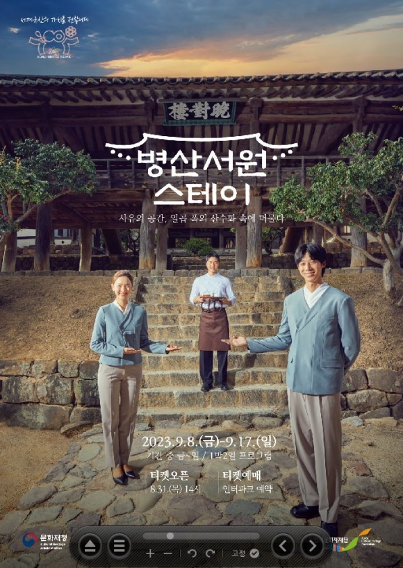 유네스코 세계문화유산의 가치와 의미를 경험하는 기획 프로그램 『병산서원 스테이』가 9월 8일(금)부터 17일(일)까지 기간 중 1박 2일씩 총 4회에 걸쳐 운영된다. 『병산서원 스테이』는 유네스코 세계문화유산이자 한국 서원 건축의 백미인 병산서원을 배경으로 역사와 문화를 스토리텔링하고, 특별한 식사와 정갈한 스테이 공간으로 품격을 높인 1박 2일 프로그램이다. 고건축물에서 자연을 만나고 선비의 정신을 음미하며 특별한 미식과 함께 오늘을 살아갈 통찰을 얻어 갈 수 있도록 구성했다. 병산서원은 조선시대의 대표적인 유교 건축물로서 서애 류성룡(柳成龍) 선생을 배향한 서원이다. 특히, 병산서원 만대루는 자연의 경치를 빌려와 아름다움을 살려내는 전통 조경 수법인 ‘차경(借景)’의 예를 잘 살린 누각이다. 7칸의 긴 누마루에 낙동강과 병산의 아름다운 풍광이 마치 7폭의 병풍처럼 담겼다. 참가자들은 시간의 흐름에 따라 변화하는 병산서원의 미적 공간을 온전히 체험한다. 병산과 낙동강 물길의 절경을 감상하며 하회-병산 간 유교문화길을 걷고, 강의 중심이 아닌 스며들 듯 사유하는 성리학 프로그램을 경험한다. 또한, 유교문화가 묻어 나는 특색 있는 안동 종가상차림도 맛본다. 서애 류성룡 종가의 조상에 대한 섬김과 함께 편안하고 따뜻한 휴식으로 손님을 맞이한다는 의미를 담아낸 온휴반상, 해질녘이 가장 아름다운 금빛 만대루에서 3가지 차와 다과를 맛볼 수 있는 가을다과상, 그리고 마, 시금치, 흑임자로 세 가지 맛을 전하는 부드러운 조반인 삼색 온죽상이 준비되어 있다. 한식을 바탕으로 자연을 담아내는 김동기 대한민국 국가대표 쉐프와 협업해 이루어진다. 이번 병산서원 스테이의 콘셉트는 ‘비움으로 채움’이다. 지나치게 많은 생각들로 중요한 것을 놓치고 살아가는 현대인들에게 성리학에서 길어 올린 필요한 만큼만 취하고 내려놓는 지혜를 만나게 한다. 참가 1일 차에는 5시경 입소해 방을 배정받고 존덕사에 올라 묵념을 하는 시간을 가진다. 고직사에서 저녁 식사를 하고 만대루에서 다담과 강독 시간을 가진 후 동재와 서재, 입교당과 전사청에서 숙박하게 된다. 2일 차에는 고직사에서 아침 식사를 하고 유교문화길을 산책한다. 이번 행사는 문화재청(청장 최응천)이 주최하고 한국문화재재단(이사장 최영창)이 주관하는 2023년 세계유산축전 기획프로그램이다. 회당 14명씩 사전예약제로 운영되며 비용은 3만 원이다. 8월 31일(목)부터 인터파크를 통해 예약할 수 있다. 안동시 관계자는 “세계문화유산 병산서원에 관심을 가질 수 있도록 서원을 활용하는 프로그램을 지속 운영해 한국정신문화수도에 걸맞은 안동만의 힐링 여행을 선보이겠다”라고 전했다. *문의 : 한국문화재재단 ☎ 02)2270-1272, 1278 |