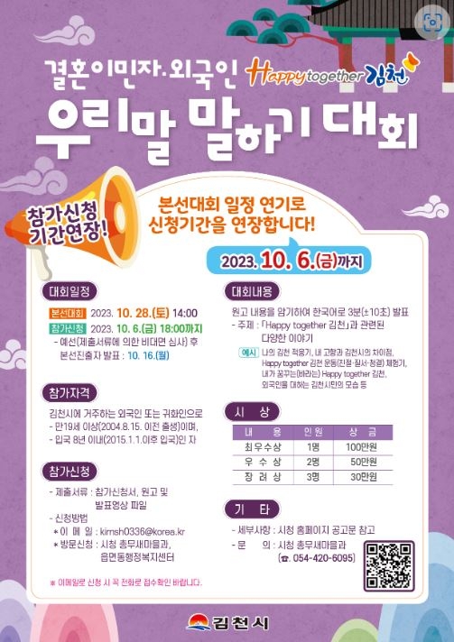 김천시는 ‘결혼이민자·외국인 Happy together 김천 우리말 말하기 대회’ 참가 신청을 10월 6일(금)까지 연장 접수한다.