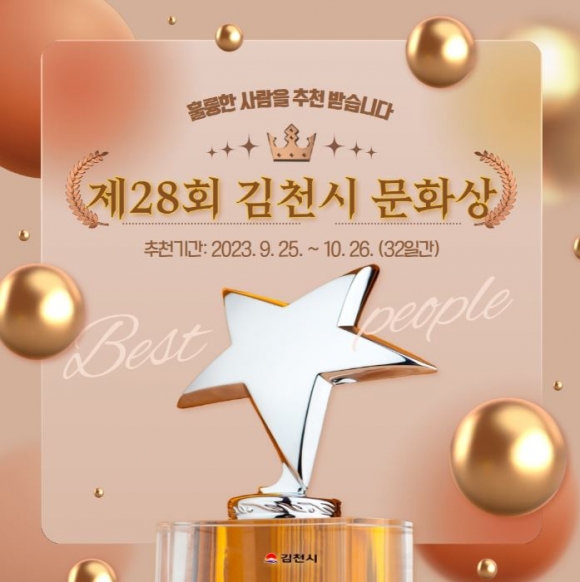 김천시는 9월 25일부터 10월26일까지 ‘제28회 김천시 문화상’ 수상 후보자를 공개 추천받는다.