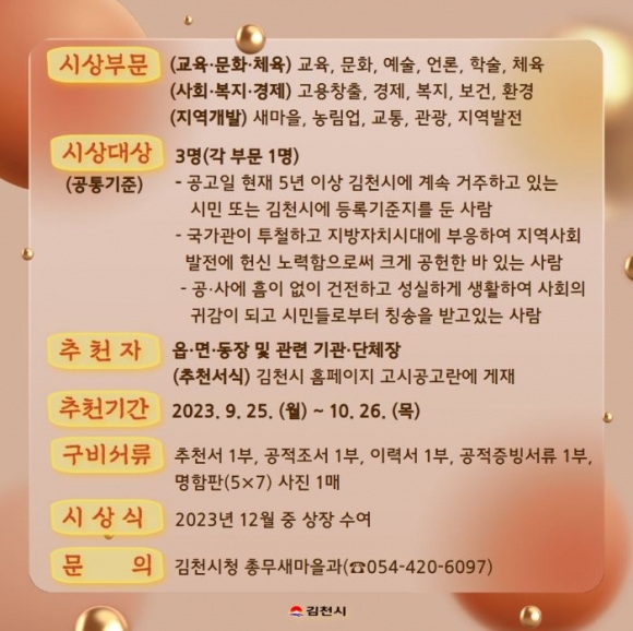 심사기준 및 추천 서식 등 자세한 사항은 오는 25일부터 김천시 누리집(홈페이지) 고시공고란에서 확인할 수 있다. (문의: 김천시 총무새마을과 ☏420-6097) |