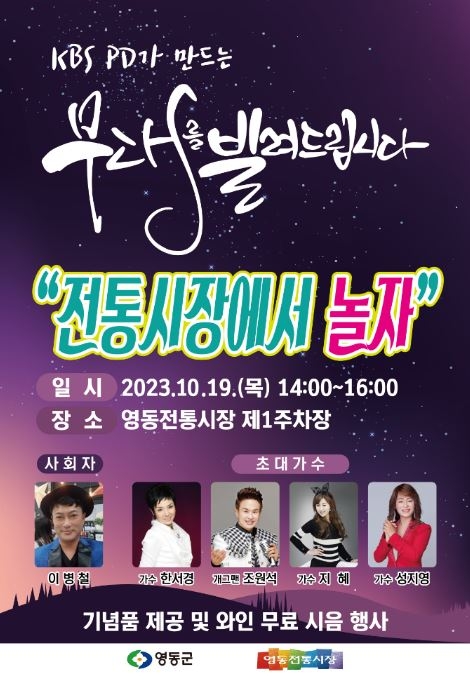 행사는 오후 2시부터 4시까지 이어지며 사회자 이병철을 비롯한 초대 가수 △한서경 △조원석 △지혜 △성지영의 공연은 전통시장의 분위기를 한층 더 띄워줄 것이다.