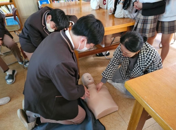현동중학교(교장 김양훈)는 10월 23일(월) 7교시에 도서관에서 전교생을 대상으로 심폐소생술 교육을 진행하였다. 강사는 청송교육지원청 순회보건교사가 담당하였다. 1학기에 이어서 2학기에 두 번째 심폐소생술 교육을 실시했다. 교육 내용은 심폐소생술교육, 인공호흡, 심장충격기사용법(AED), 하임리히법으로 이루어졌다. 심폐소생술은 마네킹을 이용하여 학생들이 실시해보았으며, 심장충격기 사용법 또한 마네킹과 교육용 심장충격기를 이용하여 실제상황처럼 이루어졌다.