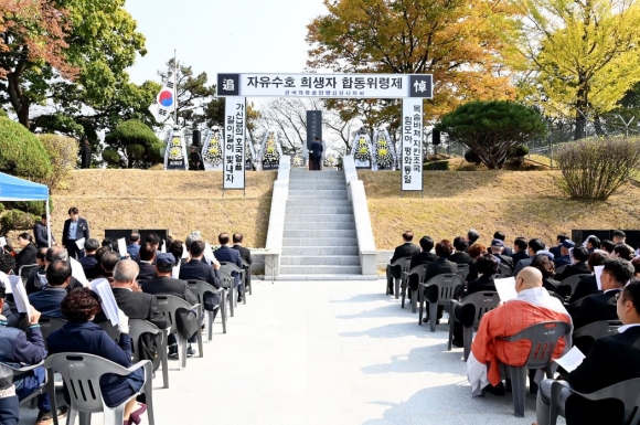한국자유총연맹 김천시지회(회장 정병기)는 26일 김천시 성내동 일원에 있는 자유 수호 희생자 추모비 광장에서 ‘제43회 자유 수호 희생자 합동 위령제’를 개최해 한국전쟁 당시 희생된 호국영령을 추모했다.