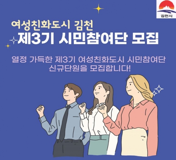 김천시는 오는 10. 30.(월)부터 11. 10.(금)까지 12일간 제3기 여성친화도시 시민참여단 40여 명을 모집한다.