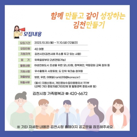 자격은 김천시에 주소를 두거나 사업장이 있는 20세 이상 시민이면 누구나 지원할 수 있으며, 시청 누리집 고시공고에서 신청서를 내려받아 전자우편(rari6318@korea.kr) 또는 가족행복과(시청1길 1)를 방문해서 제출하면 된다.