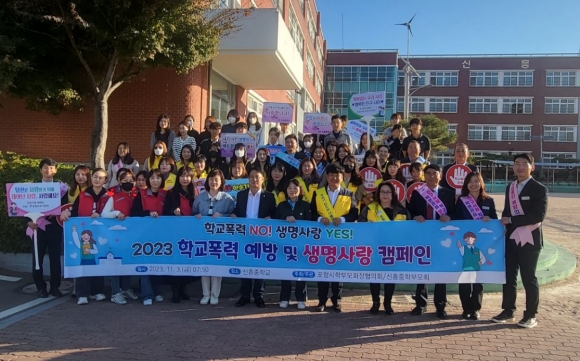 □ 포항시학부모회장협의회(회장 송재만)는 11월 3일(금) 학생들의 등교 시간에 맞춰 신흥중학교에서 학교폭력을 예방하고 생명사랑을 실천하기 위한 연합 캠페인을 실시하였다.