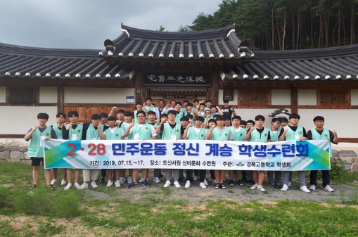[밝은미래신문=뉴스팀]경북고등학교(교장 정덕영),는 7월 15일부터 17일까지 1학년 21명, 2학년 17명 대상 2박 3일 과정으로 2.28 민주운동 정신을 계승하고 학생으로서의 자질 함양과 선비정신 배양을 통해 21세기를 대비하는 리더십을 기르기 위해 학생수련회를 실시했다. 1,2학년 학생회 간부, 창체.율동아리 부장, 역사.화에 관심이 있는 학생 중 희망하는 학생을 대상으로 학생으로서의 자질 함양과 지도력 배양, 정신력 강화 및 극기력 신장을 위한 활동을 사제동행하여 진행하였다. 숙소는 섬김의 리더십을 배울 수 있는 도산서원 선비문화수련원과 독립투쟁에 평생을 바친 육사 이원록선생의 숭고한 정신이 깃든 이육사문학관 생활관이었다. 1일차에는 도산서원과 퇴계종택에서 서원의 기능과 구조에 대해 배우고 퇴계선생의 삶을 생각하는 기회가 되었다. 2일차에는 이육사문학관을 탐방하여 육사선생의 문학과 선비정신에 대해 생각하고 퇴계묘소를 탐방했다. 오후에는 퇴계선생의 좌우명으로 탁본 체험하기, 전통 인사예절 익히기, 퇴계태실과 온계종택 방문, 정심투호로 마음 공부하기, 애국지사 김용환의 삶 영상시청 등의 활동을 하였다.