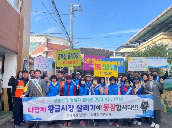 황금시장 상인회(회장 박선광)는 지난 9일 양금동 양금폭포농악단과 바르게살기협의회 회원 20여 명이 모여 ‘황금시장 살리기’ 계획으로 시장 일원을 돌며 거리 운동과 환경정화 활동을 했다.