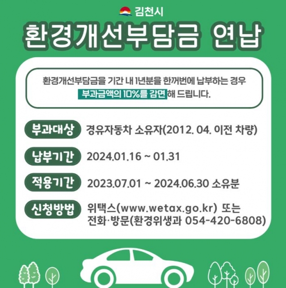 김천시는 환경개선부담금 부과 대상 경유 자동차를 소유한 자를 대상으로 2024년 1월 16일부터 31일까지 환경개선부담금 일시 납부(연납) 신청받는다.