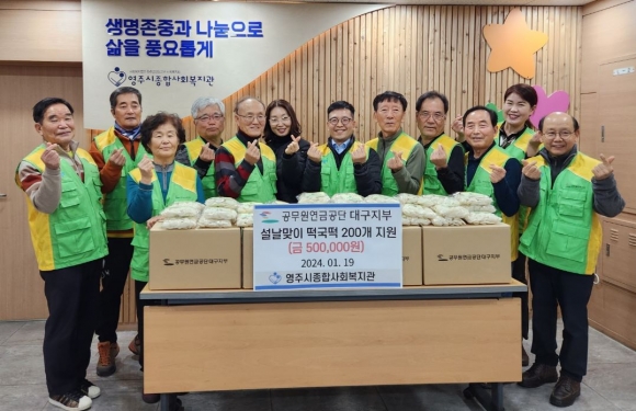 공무원연금공단(이사장 김동극) 대구지부는 19일 영주시종합사회복지관(관장 허경운)을 찾아 영주지역 소외계층 어르신들을 위한 급식 나눔 봉사활동을 실시하였다. 이날 활동에는 공무원연금공단 대구지부 직원과 영주지역 퇴직공무원으로 구성된 영주상록자원봉사단원 15여 명이 참여했다. 복지관 경로식당을 이용하는 200여명의 어르신들에게 따뜻한 점심식사를 위한 배식봉사와더불어 새해맞이 떡국을 나누었다. 공무원연금공단 박종무 대구지부장은 “어르신들의 건강과 행복을 기원하는 마음을 담아 작은 정성을 나누었다.”라며, “앞으로도 다양한 사회공헌활동을 통해 지역민과 상생하며 나눔 문화가 확산될 수 있도록 노력 하겠다,”고 말했다. 한편, 영주상록자원봉사단(단장 박성락)은 도시락 배달 및 급식 나눔 활동 외에도 시니어 스마트폰 지도 등 다양한 재능 나눔 활동을 통해 퇴직공무원의 사회적 가치를 실천하고 있다. |
