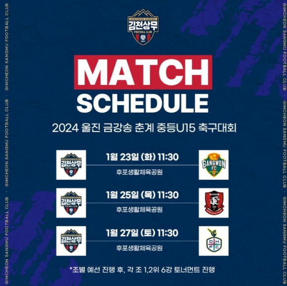 김천상무 U15는 B조에 배정되어 23일(화) 강원FC U15(주문진중학교)와 경기를 시작으로 대전하나시티즌 U15, 부천FC U15와 순차적으로 경기를 치른다. 경기 장소는 후포생활체육공원이다. 조별 예선을 통과한 각 조 1, 2위는 6강 토너먼트에 진출한다.