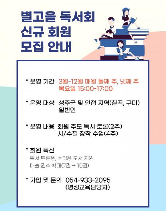 □ 회원 모집은 연중 상시로 이뤄지며, 가입 신청 및 독서회 운영에 대한 문의는 평생교육담당자(☏ 054-933-2095)로 하면 된다. |