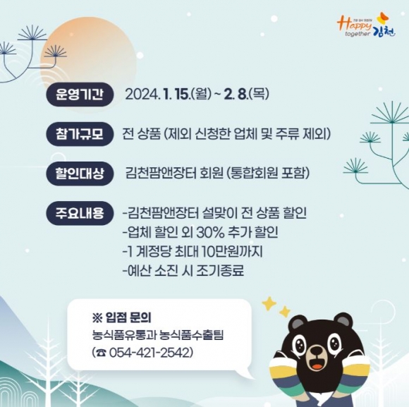 경상북도 김천시는 이번 설을 맞이하여, 인터넷 쇼핑몰 ‘김천팜앤장터’에서 2월 8일까지 2024년 설 맞이 대규모 할인행사를 진행한다.