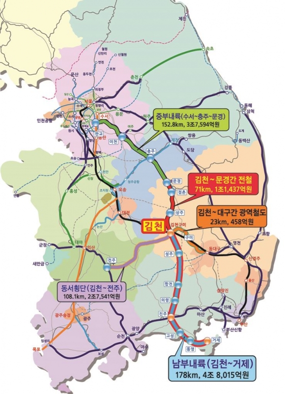 ‘사람이 모이고, 기업이 모이는 도시’를 만들기 위한 필수조건인 편리한 교통망 구축에도 모든 역량을 총동원하고 있다. 김천~거제, 김천∼문경, 김천~전주 간 철도구축 사업과 대구광역전철망 김천연장을 착실히 추진하고 고속철도가 정차하게 될 김천역사 신축 및 역세권 개발도 계획하고 있다.