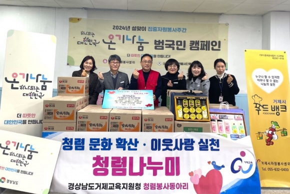거제교육지원청(교육장 김재훈) 청렴봉사동아리‘청렴나누미’는 2024년 설 명절을 맞이하여 거제교육지원청 직원들의 따뜻한 마음을 담아 거제시자원봉사센터 푸드뱅크에 3백만 원 상당의 식품과 생필품을 기부했다. 기부물품은 거제시자원봉사센터 자원봉사자들의 후원으로 설 명절 전에 다문화가정, 한부모가정 등 40여 가구의 유, 초, 중, 고등학생들에게 배달될 예정이다. 거제시자원봉사센터 김창호 센터장은 “지역 사랑과 나눔 실천을 몸소 보여주고 있는 거제교육지원청과 청렴나누미봉사단의 활동은 기부문화 확산에 큰 도움이 될 것이다. 학생들이 풍성한 마음으로 설을 보낼 수 있도록 마음 써주어 고맙다.”라며 감사의 마음을 전했다.