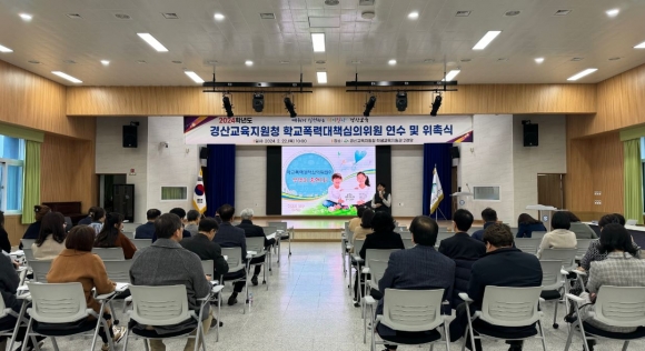 □ 경상북도경산교육지원청(교육장 이양균)은 2024년 2월 22일(목) 10시 경산교육지원청 학생지원관 2강당에서 2024년 학교폭력대책심의위원회 심의위원 위촉식 및 역량강화 연수를 실시하였다. 연수는 위촉된 심의위원 45명을 대상으로 학교폭력 예방 및 사안처리에 대한 이해증진으로 학교폭력대책심의위원의 역할을 강화하고 전문성을 신장하기 위하여 실시하였다. 이번에 위촉된 심의위원은 2024. 3. 1.~2026. 2. 28.(2년) 기간 동안 경산관내 초·중·고·특수·각종학교의 학교폭력 사안을 심의 및 의결할 예정이다.