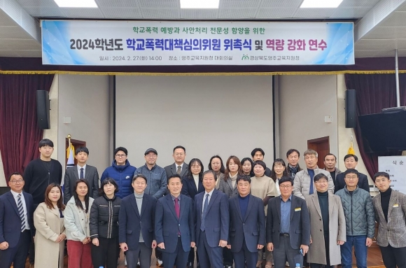 경상북도영주교육지원청(교육장 전태영)은 2월 27일 영주교육지원청 3층 대회의실에서 학교폭력대책심의위원 37명을 대상으로 학교폭력대책심의위원회 위촉식 및 역량강화 연수를 실시했다.