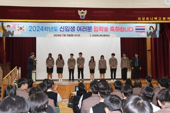 의성유니텍고등학교(교장 박기환)에서는 3월 4일 예공관(체육관)에서태국 우수 유학생 8명과 함께 2024학년도 글로벌 입학식을 가졌다. 최선지 경북교육청 정책국장과 최인호 의성유니텍고등학교 동창회장을 비롯한 많은 내빈들이 우수 유학생과 함께하는 의성유니텍고등학교의 새로운 출발을 축하 하고 55명 신입생들의 행복한 미래를 함께 응원하였다.