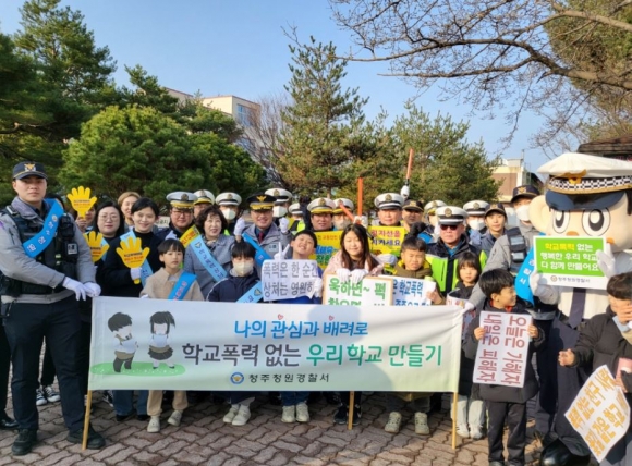 □ 이번 캠페인 활동을 위해 청원경찰서에서는 청원경찰서장 및 여성청소년과와 도로교통과의 다수의 직원들이 적극적으로 협조 및 참여하며 학교폭력예방을 위한 물품도 나누어주며 캠페인 활동을 꾸렸다. 또한 주성초등학교에서도 전교 어린이회 임원을 비롯한 3~6학년 각 학급 학생들과 학부모, 교사 모두가 함께 참여하여 안전하고 행복한 학교와 등굣길을 만들기 위한 의미 있는 시간을 가졌다.