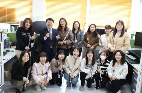 논산계룡교육지원청, ‘세계 여성의 날’맞아 출근길 직원에 장미꽃 전달