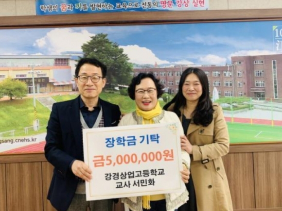 강경상업고등학교(교장 이광희)에서 명예퇴직한 교사 서○화(영어)가 2024년 2월, 36년 10개월의 교직 생활을 끝내며 학생들의 교육을 위해 장학금 5,000,000원을 본교에 기탁했다.