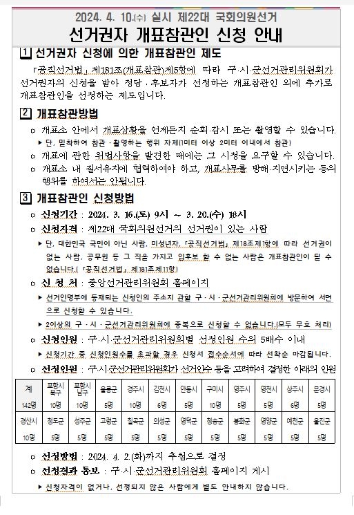 제22대 국회의원선거 선거권자 개표참관인 공개 모집