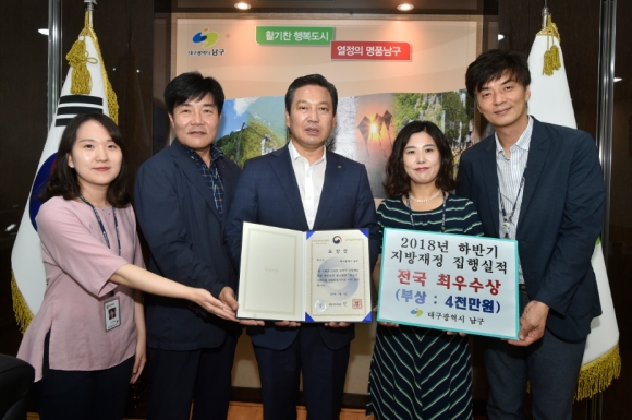 [밝은미래신문=뉴스팀]대구광역시 남구청(구청장 조재구)은 행정안전부에서 주관한 ‘2018년 하반기 지방재정집행 평가’에서 최우수 기관으로 선정되어재정 인센티브 4천만원을 받았다.