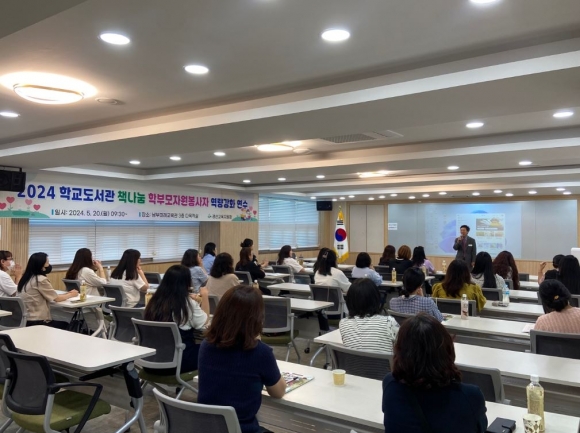 경상북도경산교육지원청(교육장 박경화)은 2024. 5. 20.(월) 경상북도 남부미래교육관에서 경산, 청도 지역의 초, 중, 고 학교도서관 책나눔 학부모자원봉사자 70여명을 대상으로 도서관 지원을 위한 역량강화 연수를 실시하였다.