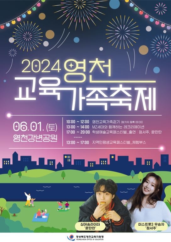 경상북도영천교육지원청(교육장 김희수)은 6월 1일(토) 09:30부터 영천강변공원에서 유·초·중·고등학생 및 학부모, 지역주민 등 영천교육가족 약 5천명을 대상으로‘2024 어울림으로 행복한 별빛 영천교육가족축제’행사를 개최한다.