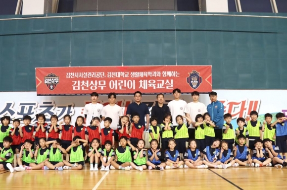김천상무프로축구단(대표이사 배낙호)이 23일 김천실내 배드민턴장에서 어린이 체육교실을 진행했다. 해오름유치원생 40명을 대상으로 열린 행사는 축구, 배드민턴을 활용한 유아체육 프로그램으로 이루어졌다.
