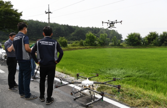 드론 방제사업은 논 농업에 우선 지원한다. 이와 과련해 시는 19일 안정면 여륵리 257번지 안웅기씨 소유농지에서 드론을 활용한 병충해 방제 시연을 펼쳤다.