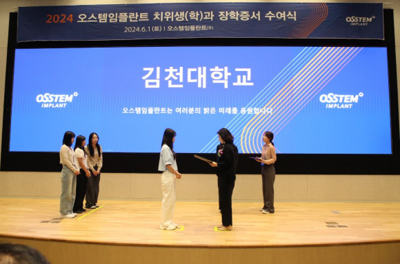 김천대학교(총장 윤옥현) 치위생학과(학과장 조민정)는 (주) 오스템임플란트(최규옥회장) 마곡본사에서 열린 2024 치위생(학)과 장학증서 수여식에서 재학생 4명이 장학증서를 받았다고 3일 밝혔다.