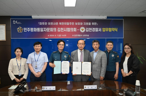 김천경찰서는 지난 7일 김천경찰서 소회의실에서 채승기 김천경찰서장과 정병기 협의회장을 비롯한 관계자들이 참석한 가운데 ‘북한이탈주민 보호와 지원을 위한 업무 협약식을 체결했다.