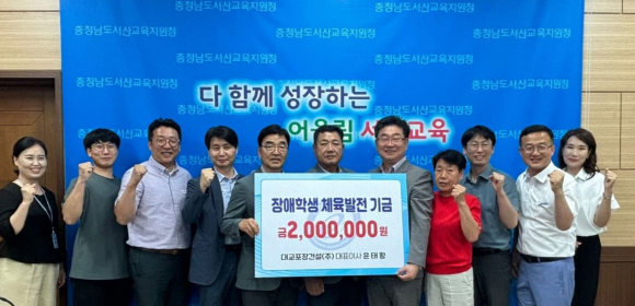 충청남도 서산교육지원청(교육장 성기동)은 2024년 6월 17일 장애학생 체육발전기금 전달식을 가졌다. 이 행사에서 대교포장건설 윤태황 대표이사는 장애학생들의 체육발전을 위해 금 200만원을 기부하며 따뜻한 마음을 전했다.