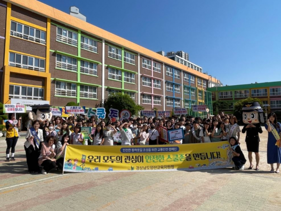 양산교육지원청은 ‘우리 모두의 관심이 안전한 스쿨존을 만듭니다!’라는 슬로건 아래 스쿨존 내 제한속도 지키기 및 주정차 금지 등 교통법규 준수 등 지속적인 캠페인 활동을 통해 어린이 보호구역 내 학생의 안전한 보행권 확보, 운전자의 서행 운전을 유도하여 학생들이 안전하게 등하교할 수 있도록 매월 교통안전 캠페인 및 통학로 안전 점검을 실시해 오고 있다.