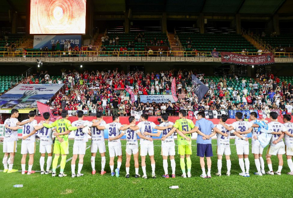 이날 김천상무의 승리는 선수들이 힘을 얻을 수 있도록 쉬지 않고 응원을 펼친 원정 응원단이 있어서 가능했다. 이들은 ‘쿨링 브레이크’가 진행될 정도로 무더운 날씨에도 포항의 홈 관중에 대등한 응원전으로 선수들에게 힘을 불어넣었다. 경기 종료 후 선수들은 원정석을 찾아 팬들의 응원가에 맞춰 ‘어깨동무 셀레브레이션’으로 화답했다. 정정용 감독도 경기 후 기자회견에서“무더운 날씨에도 멀리 응원을 와주신 팬 여러분께 결과로 보답할 수 있어서 감독으로서 기쁘다.”라고 말하며 원정 응원단을 향한 감사를 전했다.