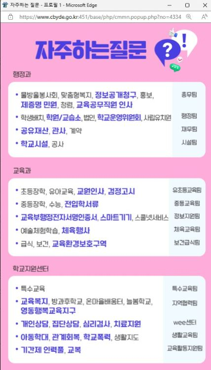 □ 영동교육지원청(교육장 손태규)은 온라인 이용자의 편의를 고려해 빈발 민원 키워드를 중심으로 홈페이지를 정비했다고 밝혔다. □ 영동교육지원청 홈페이지에 접속하면 최근 민원 동향을 파악해 선정된 유형별 최다 민원이 한판에 담겨 ‘키(기만 하면) 원(하는답을) 드(립니다)’ 팝업창으로 제공된다. □ ‘키원드’한판 디자인은 고령자 등 모바일 이용자의 가독성을 높여 접근 용이성을 향상하고자 고안됐으며, 유형별 민원을 누르면 자주묻는질문(F/Q) 창으로 연결돼 민원인의 궁금증 해소를 도울 전망이다. □ 이는 지난 5월과 7월 실시한 국민생각함 설문조사의 결과를 반영한 것으로, 영동교육지원청은 이 밖에도 민원인의 접근용이를 위해 제증명드라이브스루존 등 다양한 제도를 운영 및 개선 중이다. □ 영동교육지원청 김민진 주무관은 “기존 과별,팀별 담당업무 탭으로 접속하는 것이 모바일 기기가 익숙지 않은 고령자분들에게 불편하겠다는 생각을 했다. 기존에 제공하는 서비스나 제도에 대해 의문을 갖고 작은 것도 항상 민원인의 입장에서 생각해 나은 방향을 향할 수 있도록 노력하겠다.”고 전했다. |