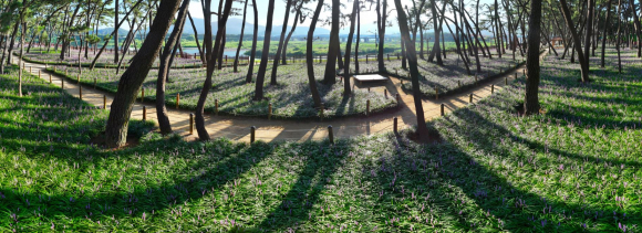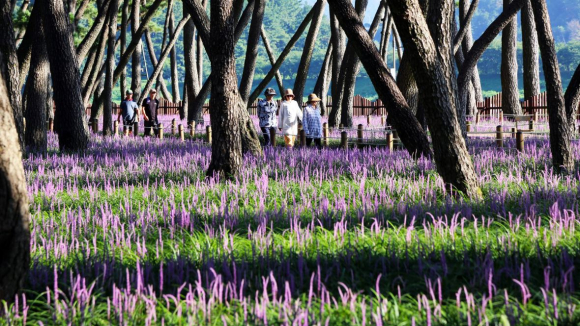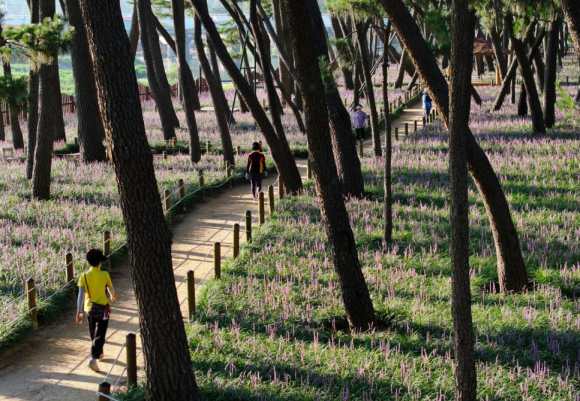 아침 햇살을 담은 삼문송림 1일 오전 밀양시 삼문송림에 아침 햇살이 스며들며 개화가 한창인 보랏빛 맥문동 꽃과 짙은 소나무 그림자가 이색적인 자연의 모습을 그리고 있다.