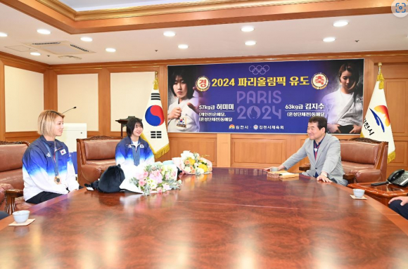 이날 2층 접견실에서 김충섭 김천시장과 최한동 체육회장, 양희철 김천시유도회장과 김정훈 경북체육회 유도팀 감독 등이 참석하여 김천에 주소를 두고 있는 허미미, 김지수 선수의 파리올림픽 메달 획득을 축하하고 그간의 노고를 위로하는 자리를 가졌다.