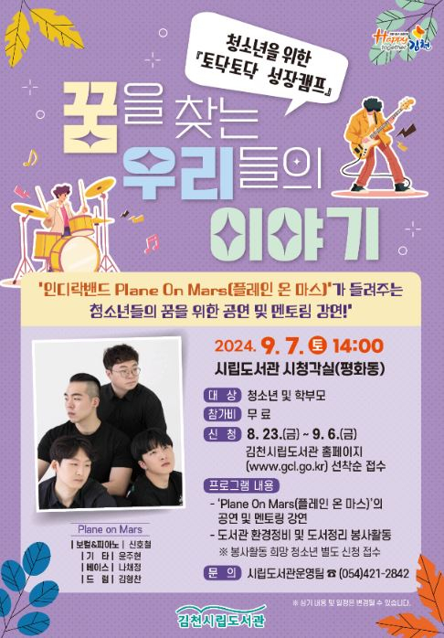 이번 프로그램은 ‘꿈을 찾는 우리들의 이야기’라는 주제로 인디밴드 플레인 온 마스(Plane On Mars)를 초청해 음악 등 다양한 분야의 직업군에 관심 있는 청소년들에게 진로탐색의 기회를 제공한다.