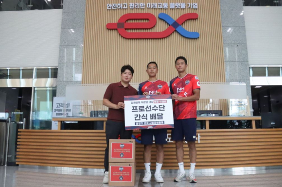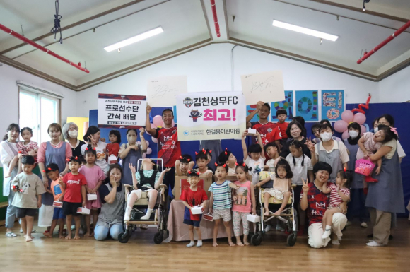 김천상무프로축구단(대표이사 배낙호)이 지난 8월 21일, 9기 김준호, 김찬과 함께 프로선수단 간식 배달 CSR행사를 진행했다. 두 선수는 한국도로공사 본사와 한걸음어린이집을 방문하여 직접 간식을 전달했다.